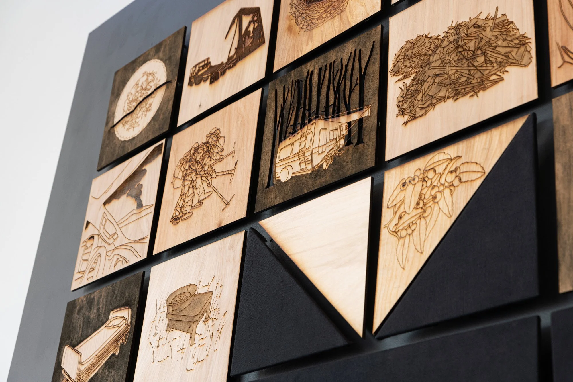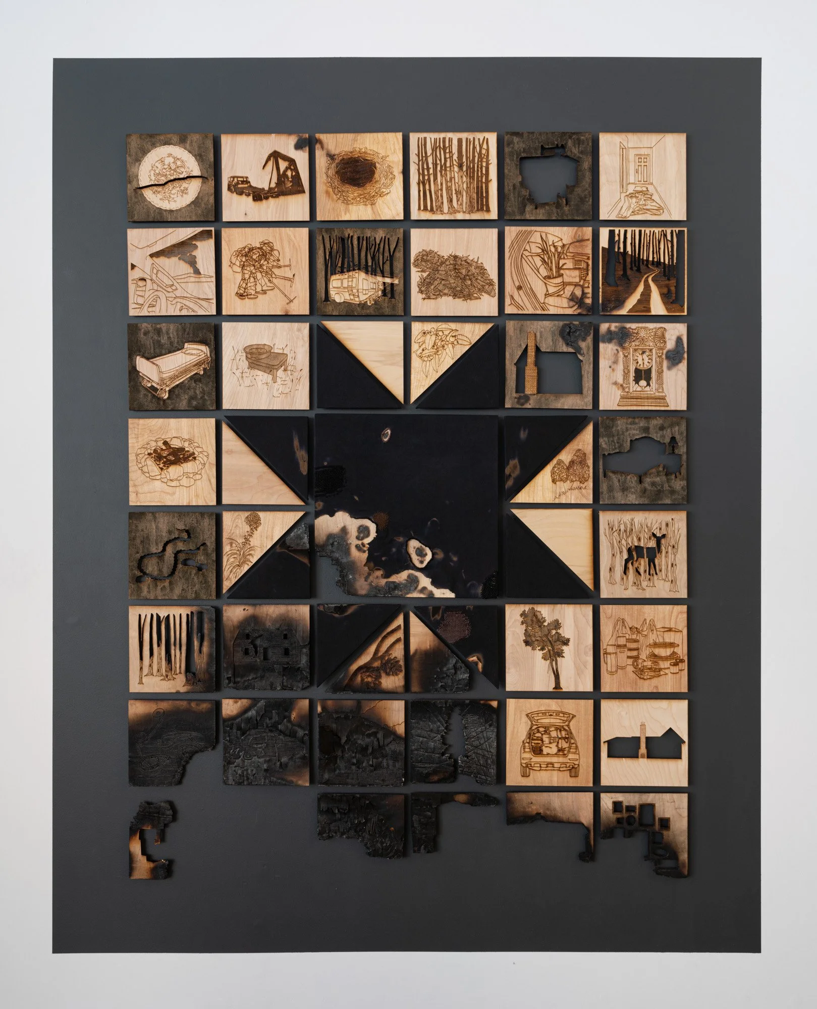 My work considers what loss looks like by examining cultural practices of mourning and grieving, the emotional weight of objects that make up our life, and the pressure point between forest lifecycles and the permanence of homes. This has been applied to the work by referencing matrilineal storytelling practices. The work centers the lived accounts of the women in my family, and my own experiences with fire.